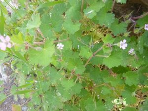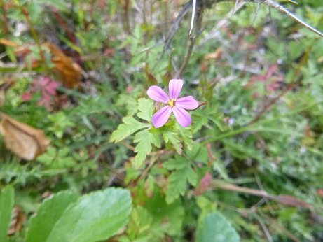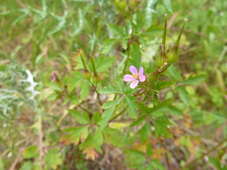 Geranium purpureum (sometimes considered a subspecies of Geranium robertianum, which besides exists on the Iberic Peninsula but not on the Balearics), the little-robin, is an annual or biennial herb of the Mediterranean and Western Europa till England. It flowers in spring and summer. The flowers are pollinated by bees. It is common on Ibiza and Formentera, mainly by the edges of trails.